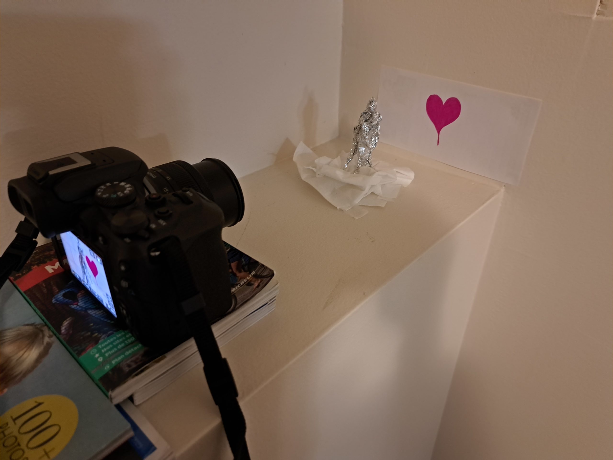 Pour tourner cette vidéo j’ai d’abord créé les personnages principaux en utilisant du papier aluminium. Ensuite, j’ai utilisé divers éléments du quotidien comme du papier ou des mouchoirs pour créer les décors. Une fois cela fait, j’ai mis mon appareil photo sur un endroit fixe en veillant à ce que le cadre et la luminosité soient corrects. Puis, j’ai pris plusieurs photos avec quelques petits changements à chaque fois afin de créer l’effet de mouvement.