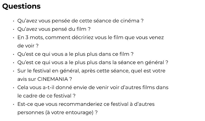 Pour répondre à cette problématique, je voulais montrer l’ambiance au sein des séances et du festival en général tout en ayant l’avis de quelques personnes. Ainsi, j’ai filmé de nombreux plans d’ambiance en portant une attention particulière sur les émotions des gens et ce qu’ils faisaient avant le début du film. J’ai ensuite réalisé 3 interviews à la fin de l’une des séances. Enfin, j’ai complété le reportage par quelques plans sur les cinémas où se déroulaient le festival et quelques plans sur des évènements “marquants” comme la présence de réalisateurs ou d’acteurs.